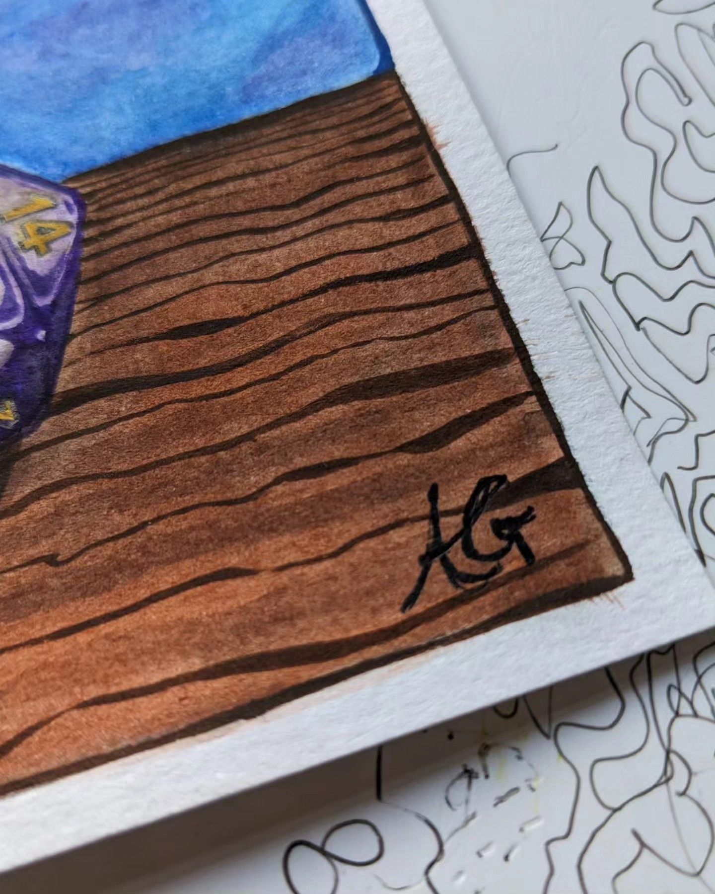 This commission was pitched to me, specifically the phrase 'Roll With It' and the request for polyhedral dice to be included. The colour choices and additional elements, like the whisky bottle and tumbler glass were my creative choices.