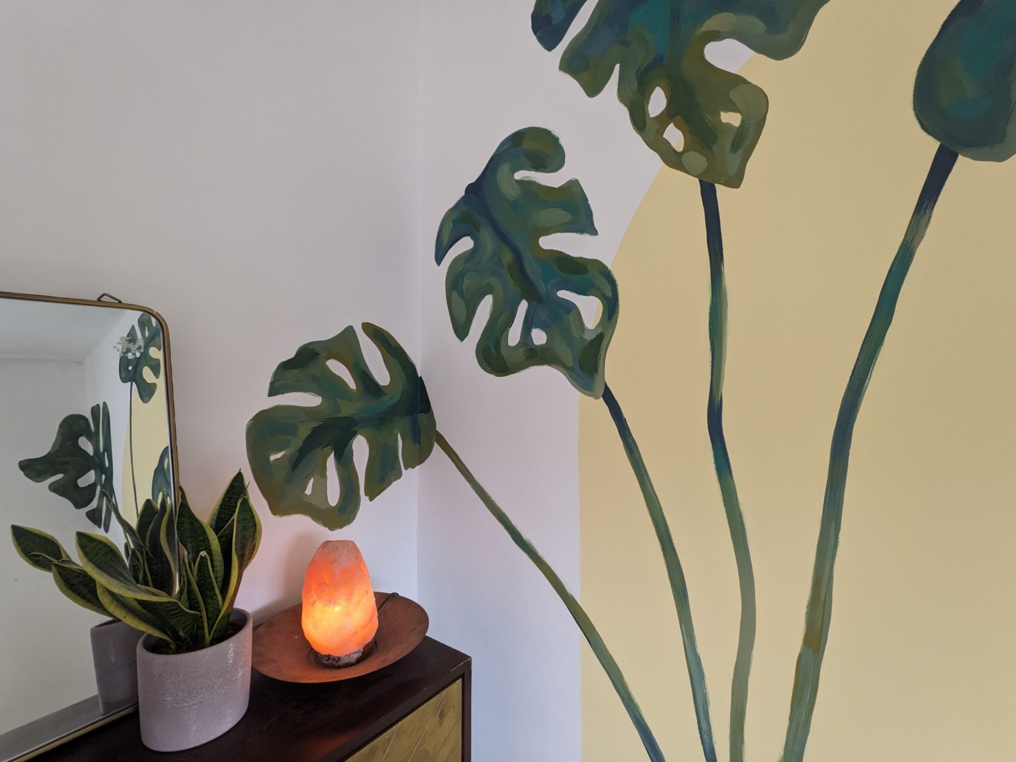 This Mural was very spontaneously created with the trust from the home owner. I mapped out the composition of each leaf first and then using a variety of sample pots of wall paints I worked in the colour and dimension.